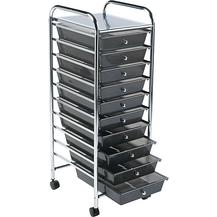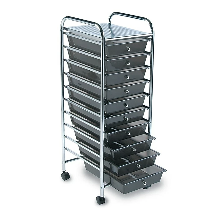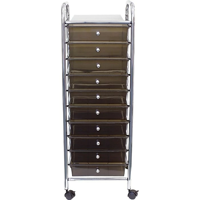 Advantus 10-Drawer rolling organizer measuring 37 1/2″(H) x 13″(W) x 15 1/4″(D) holds a wide variety of items. Rolling organizer features chrome frame with smoke drawers and 4 casters for easy movement.