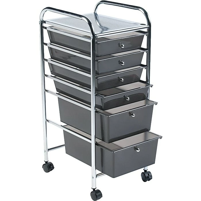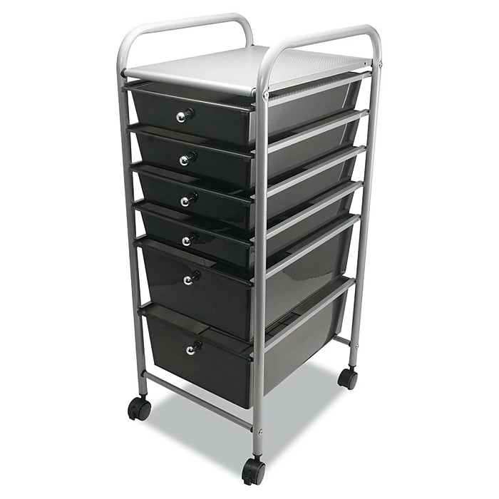 Advantus 6-Drawer rolling organizer measuring 31.75″(H) x 13″(W) x 15.25″(D) holds a wide variety of items. Rolling organizer features chrome frame with smoke drawers and 4 casters for easy movement.