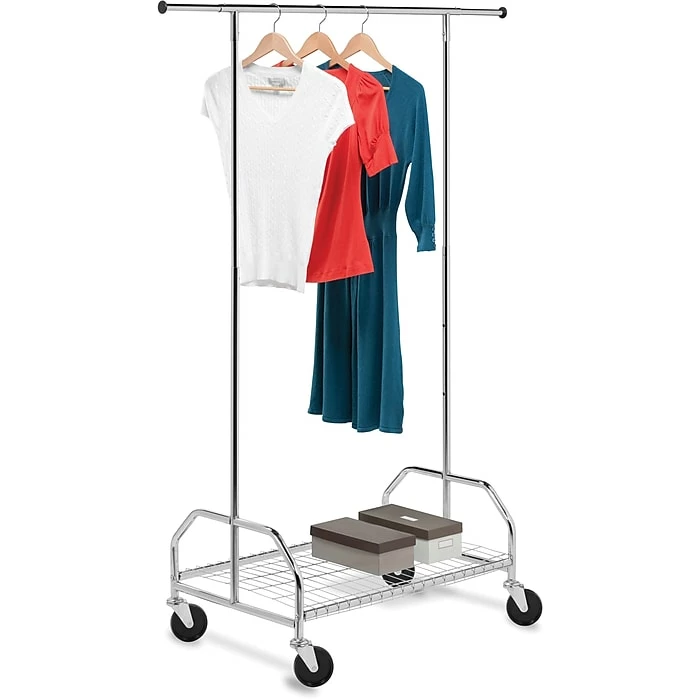 The brilliant chrome finish in this rack adds class to the durable, rust-resistant steel frame. The handy bottom shelf offers additional storage space for coordinating accessories, shoes, bags, and other items making them easily accessible. Set on smooth rolling casters, this garment rack easily moves from room to room.