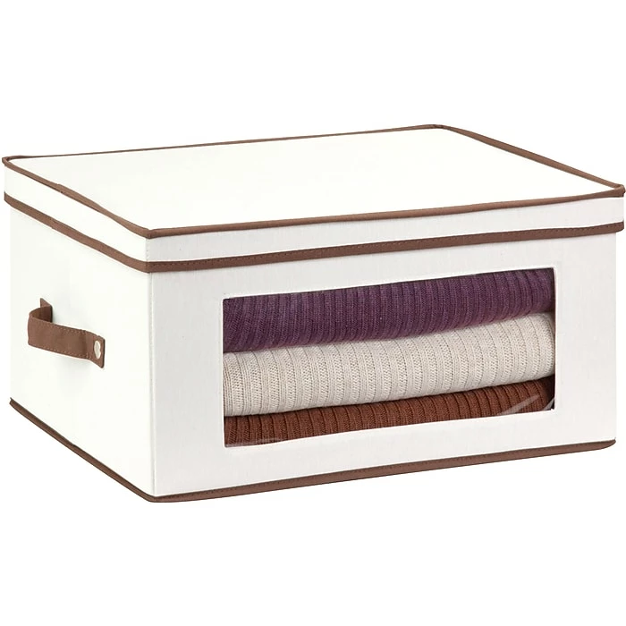 This storage box features viewing window for quick identification. The gentle and smooth handles offer convenient transfer and soft storage units that will not scratch or scuff floors or walls, and the off-white color with brown trimming looks and works ideal in bathrooms, bedrooms, and offices.