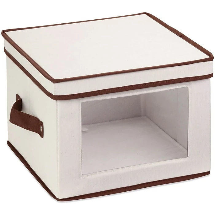 This storage box features viewing window for quick identification. The gentle and smooth handles offer convenient transfer and soft storage units that will not scratch or scuff floors or walls, and the off-white color with brown trimming looks and works ideal in bathrooms, bedrooms, and offices.