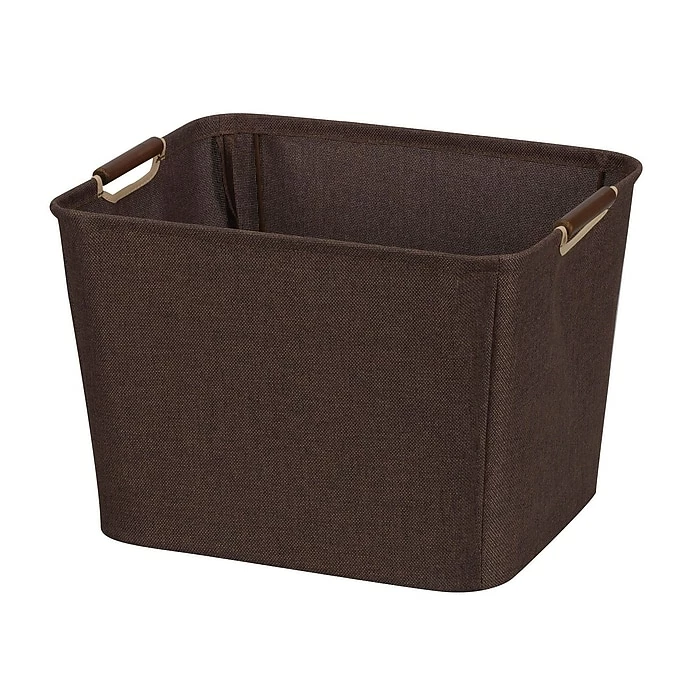Household Essentials® Medium bin in coffee linen has sturdy construction with metal frame for extra durability and stability. Bin has tapered design with sturdy wooden handles for easy use and portability.