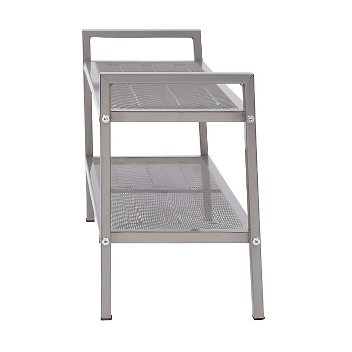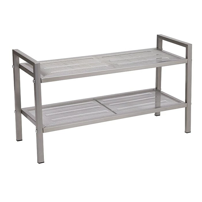 Household Essentials 2-Tier Mesh Shoe Rack brings the beautiful lines of modern industry to your footwear storage. Sleek and attractive-with 2 shelves that hold lots of shoes-it’s the perfect way to keep your shoes neat, organized, and easy to put on. Each shelf is made from a single piece of metal that has been stretched to create a fine mesh in the center. Making the shelf out of one piece of metal means no extra joints, welding, or places to catch or scratch your shoes. The shoe rack has a muted nickel finish, is easy to assemble, and has no plastic parts to break. And the shelves are spaced more widely apart than many shoe racks on the market, so men’s work boots and women’s stilettos fit with equal ease. It’s the storage space you need with the look you want.
