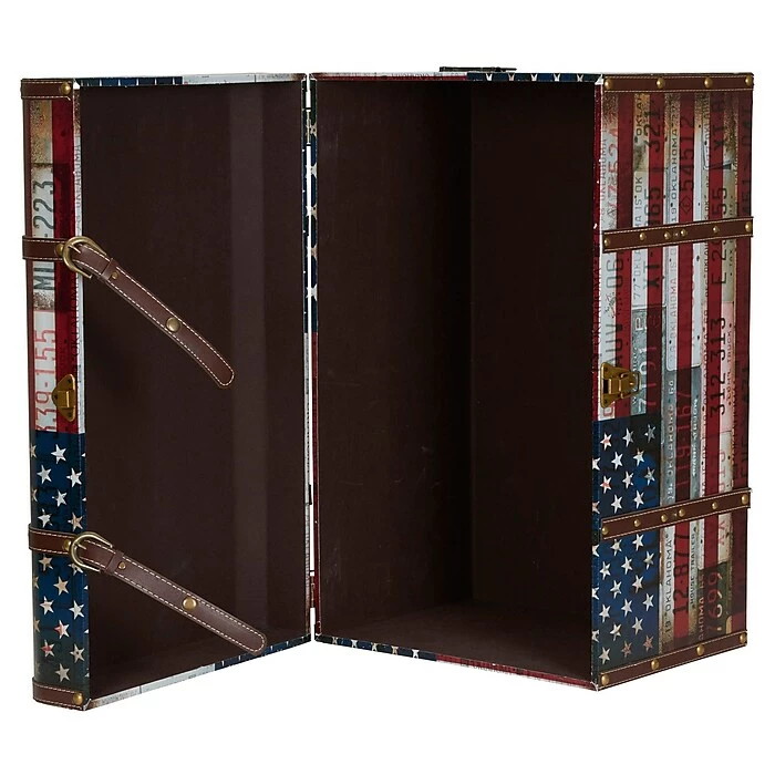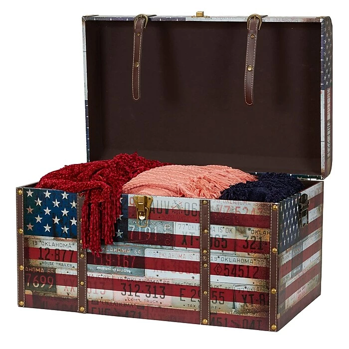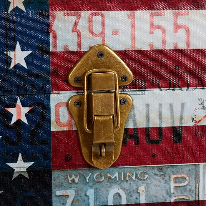 Extra large jumbo Americana flag and license plate storage trunk with leather straps and brass handles–full of vintage charm and spirit, this jumbo trunk with pp fabric liner is perfect for storing larger items like blankets, pillow and bed linens. Perfect beside a couch as a low storage side table–or put in the middle of the room as a storage coffee table! Flat topped with rounded edges for a safe and convenient storage space you’ll be proud to display. Trunk measures 16.14” H x 25.6” W x 15.2” D