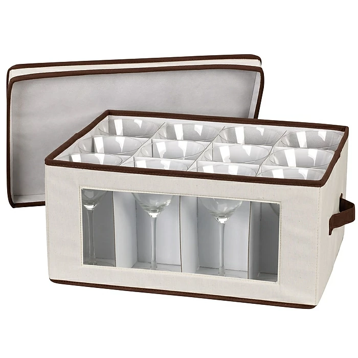 Household Essentials China storage goblet chest is equipped with felt protectors or cardboard dividers which can store up to 12 glasses. Goblet chest has two riveted handles which supports weight up to 25 lbs. and enables an easy portability.