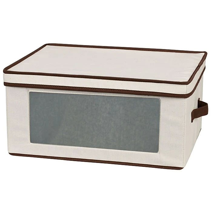 - Strong and durable boxes are attractively covered in cream-colored polyester canvas with brown trim