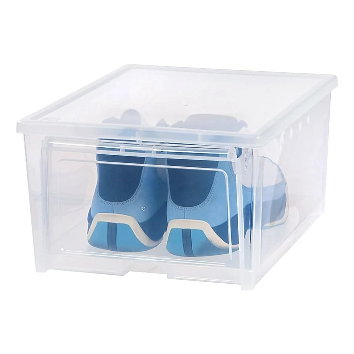This unique shoe storage box has an ultra clear window to let you see what’s stored inside. The front panel lifts up and locks into place, allowing easy access to shoes without unstacking multiple units. Ventilation holes on both sides allow air circulation. Sized to fit most men’s shoes up to size 13.