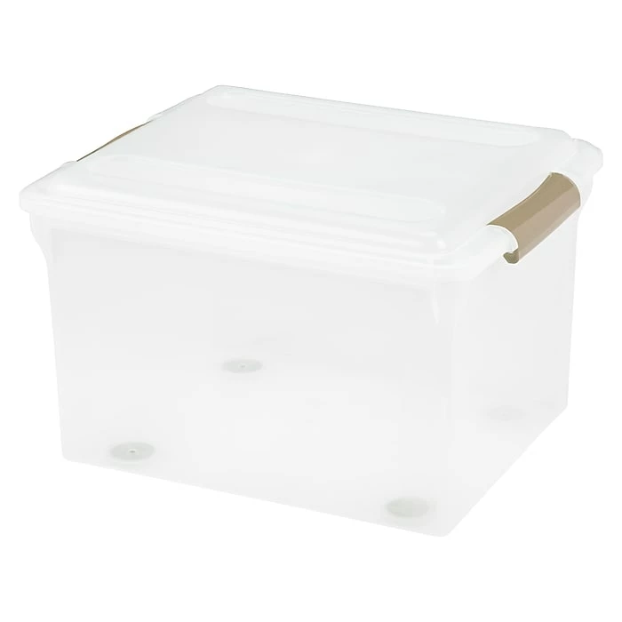 This file box has four easy glide disks on the bottom for easy moving, whether it be from a closet or under a desk. The neutral colored buckles and disks blend well with any decor – perfect for the office or home. Use it to store your letter or legal hanging files. See other items in this series: Store and Slide underbed box, square box, and deep tote box.