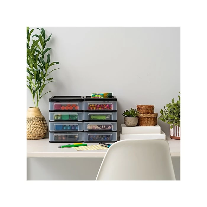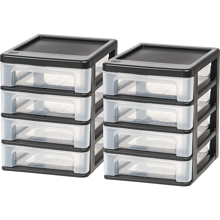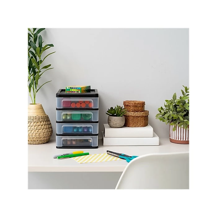 Compact and convenient, the Iris four-drawer desktop unit makes the most of your desk space. Squeeze the mini drawer unit into open space, or create a row of them for even more storage. The small plastic drawers are durable, and the smooth glides give you easy access to the contents inside. The indented top is perfect for storing additional supplies or displaying small pictures. The mini storage drawers are also great for everything from accessories and tool pieces to small bathroom supplies and more. Made in the USA.