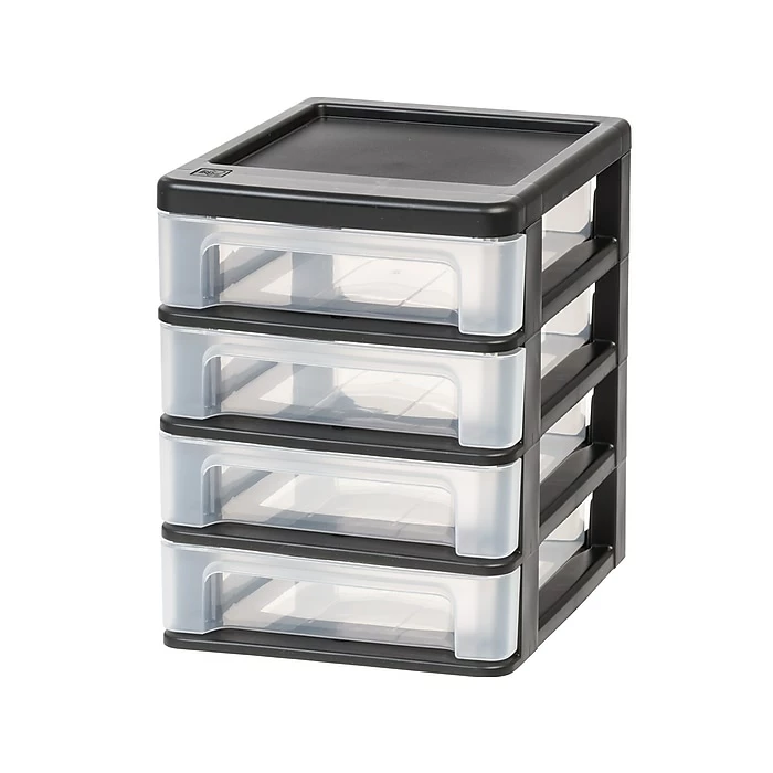 Compact and convenient, the Iris four-drawer desktop unit makes the most of your desk space. Squeeze the mini drawer unit into open space, or create a row of them for even more storage. The small plastic drawers are durable, and the smooth glides give you easy access to the contents inside. The indented top is perfect for storing additional supplies or displaying small pictures. The mini storage drawers are also great for everything from accessories and tool pieces to small bathroom supplies and more. Made in the USA.