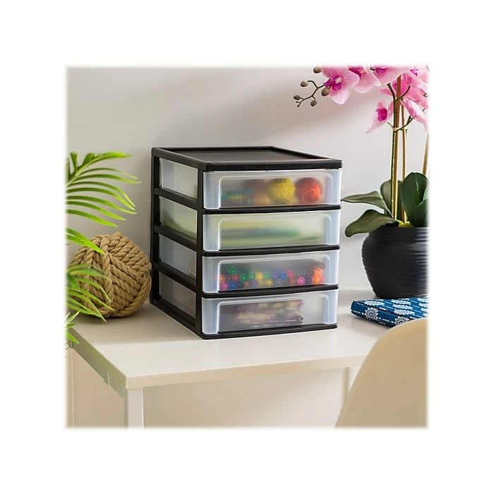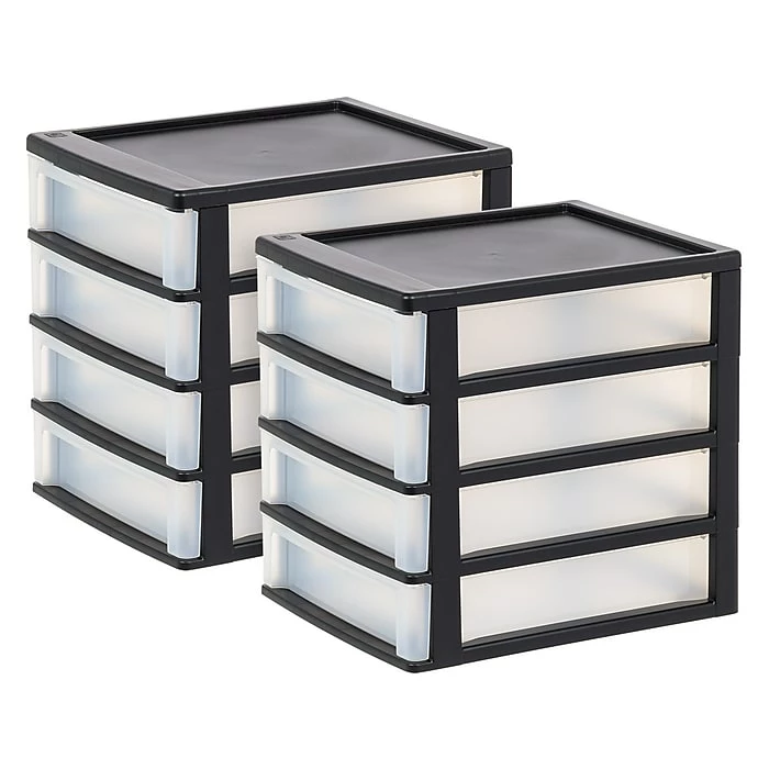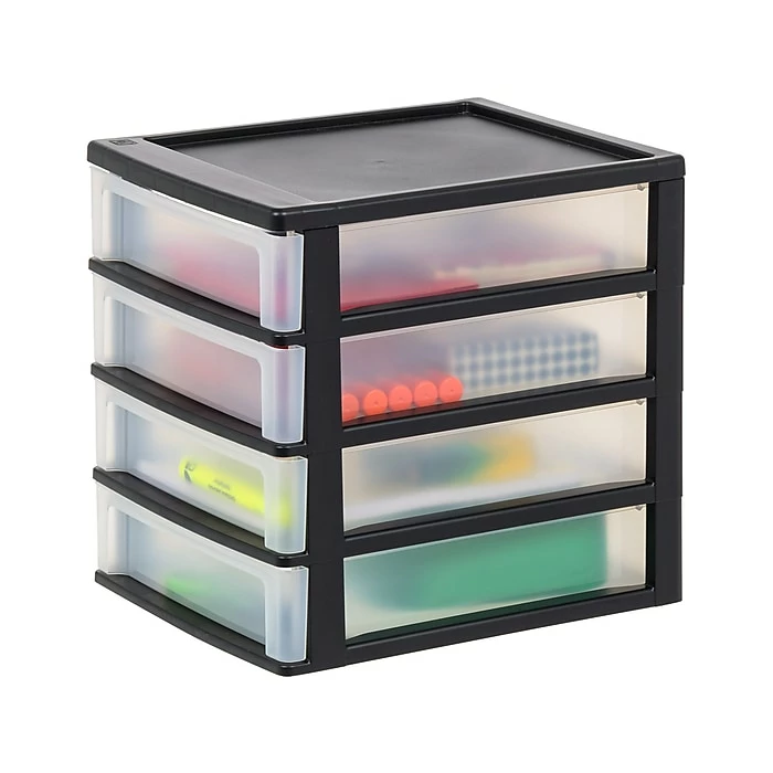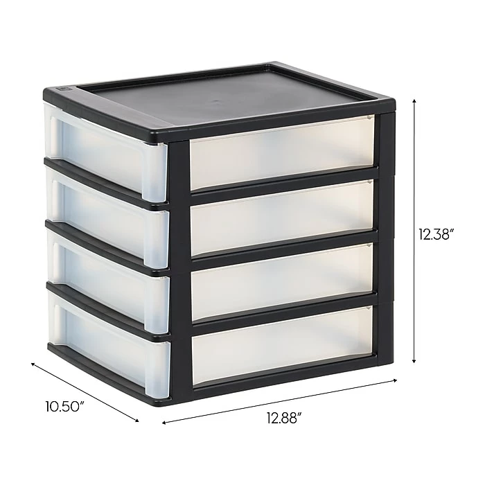 Store more with more space. The Iris four-drawer desktop unit is great for maximizing storage. Great for your home, office, or garage to clean up your desktop or shelf. Put in the drawer anything from makeup brushes, first aid, craft, and office supplies. The clear drawer makes it easy for you to see where and what you’ve placed. Stackable to save space. Organize and declutter your workspace or living area with this Iris desktop unit. Made in the USA.