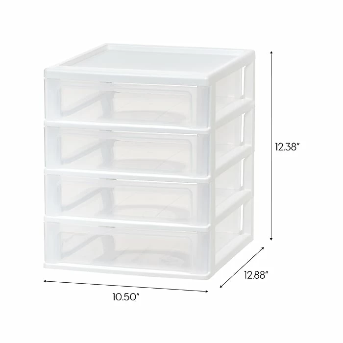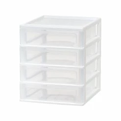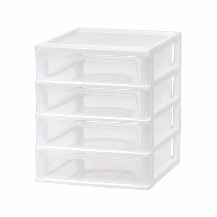 Store more with more space. The Iris four-drawer desktop unit is great for maximizing storage. Great for your home, office, or garage to clean up your desktop or shelf. Put in the drawer anything from makeup brushes, first aid, craft, and office supplies. The clear drawer makes it easy for you to see where and what you’ve placed. Stackable to save space. Organize and declutter your workspace or living area with this Iris desktop unit. Made in the USA.