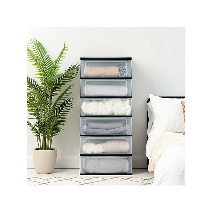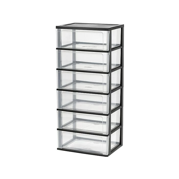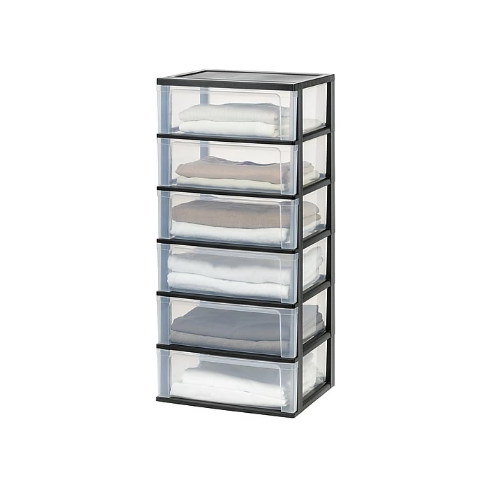 The durable six-drawer wide chest by Iris is the portable solution to any storage need. Quickly access contents with the easy-pull drawers. Built-in drawer stops prevent the drawers from falling out when opened. Perfect for everything from clothing to linens, toys, and more. Made in the USA.