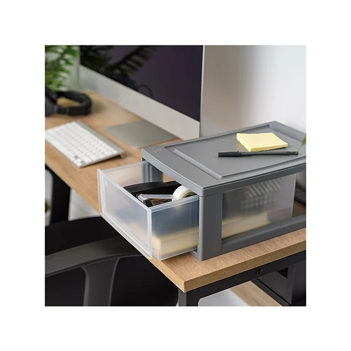 The Iris mini stacking drawer is the answer to your small storage needs. Whether you need a few small drawers for office supplies on your desk or want to build a wall for accessories or tool bits in your closet or garage, this small framed drawer stacks neatly and securely. Create your own organizational system with this mini drawer any way you choose. The sturdy plastic makes this drawer durable, and the smooth glides give you easy access to contents.