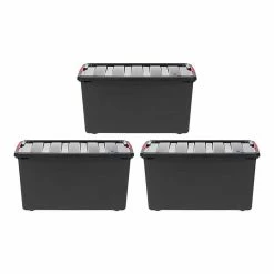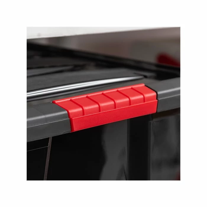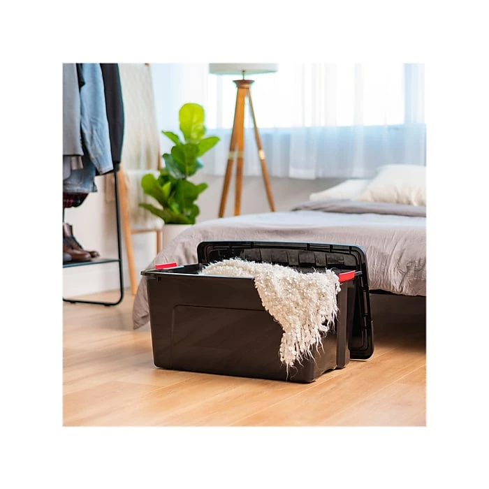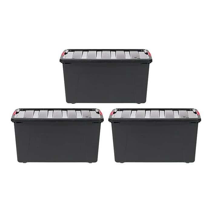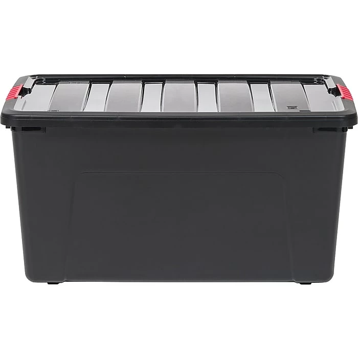 The Iris Stack & Pull 72 qt. storage box easily stores clothes, sporting equipment, blankets, and more. Sturdy buckle-up latches keep the lid securely in place, and the built-in handles make it easy to pull the bin off of a shelf. Stacks neatly with other units in the Stack & Pull series. Made of durable and economical repurposed raw material. Made in the USA.