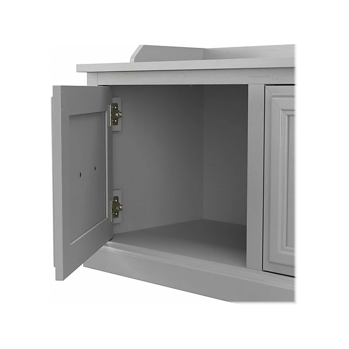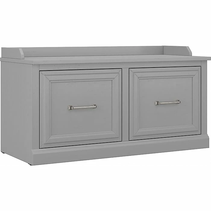 The kathy ireland Home by Bush Furniture Woodland 40″W shoe storage bench with doors combines transitional styling and a practical design to offer a perfect entryway organizer. Have a seat on the durable bench surface, and take a moment to relax as you get ready to head out the door or come home after a long day. The top of the mudroom bench supports up to 250 lbs., so you can sit down to put on and take off your shoes or set shopping bags down after a trip to the store with confidence. Cabinet doors conceal two compartments that keep footwear in order and out of sight. The shoe bench’s transitional design blends elements of contemporary and traditional styling to complement an array of home furnishings. This entryway bench with storage has been rigorously tested to meet Bush Furniture’s standards for safety, performance, and durability and is backed by a 3-year manufacturer’s warranty.
