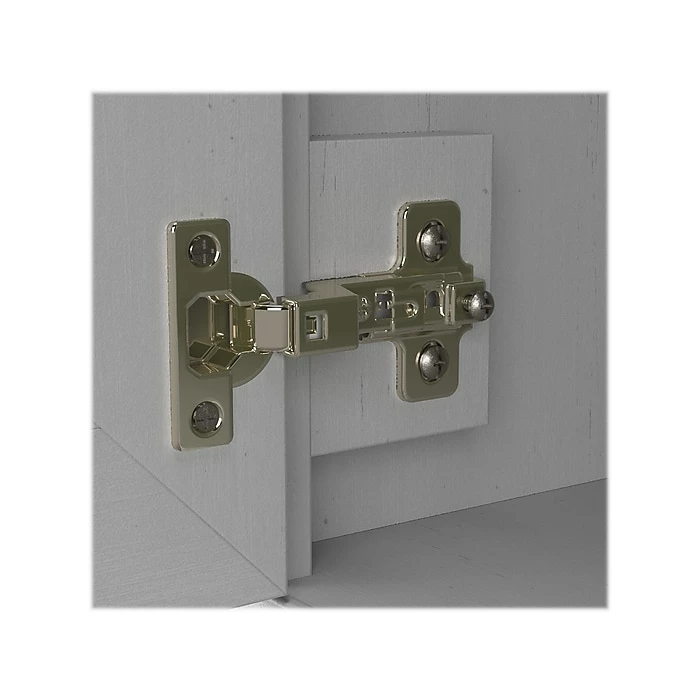 - Cabinet doors with Euro-style hinges open to reveal two compartments for storing footwear and other accessories