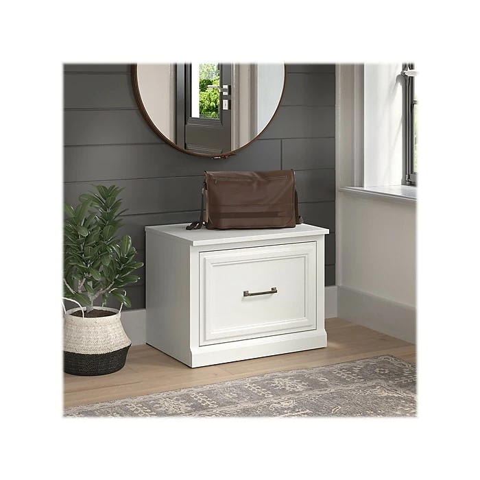 The kathy ireland Home by Bush Furniture Woodland 24″W small shoe bench with drawer combines transitional styling and a practical design to offer a perfect entryway organizer. Have a seat on the durable bench, and take a moment to relax as you get ready to head out the door or come home after a long day. The top of the mudroom bench supports 250 lbs., so you can sit down to put on and take off your shoes or set shopping bags down after a trip to the store with confidence. A small drawer opens on smooth, full-extension ball bearing slides for easy access to footwear. The storage bench’s transitional design blends elements of contemporary and traditional styling to complement a wide range of home furnishings. This small entryway bench with storage has been tested to meet Bush Furniture’s standards for safety, performance, and durability and is backed by a 3-year manufacturer’s warranty.