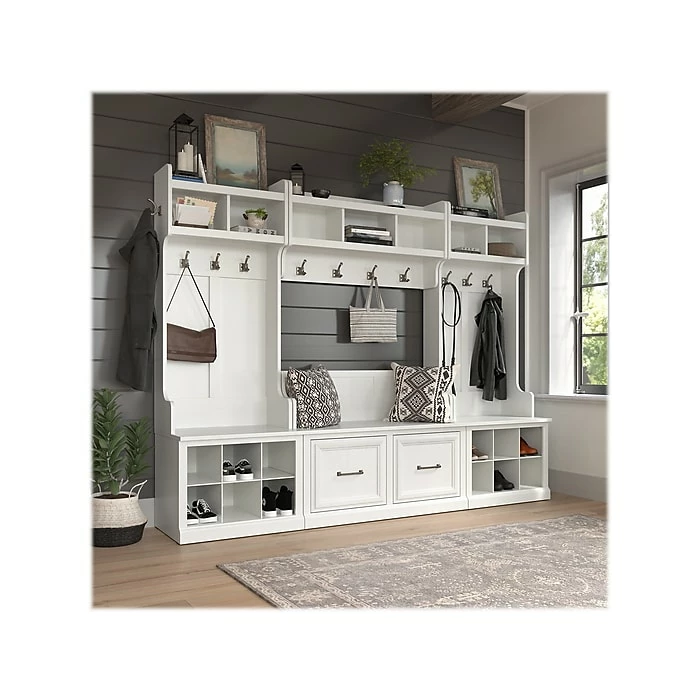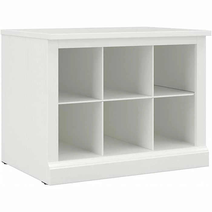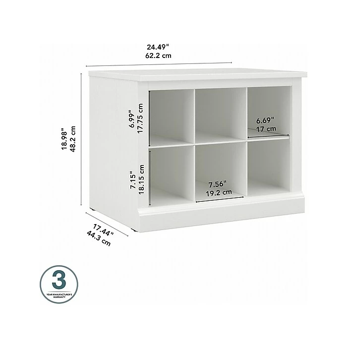 The kathy ireland Home by Bush Furniture Woodland 24″W small shoe bench with shelves combines transitional styling and a practical design to offer a perfect entryway organizer. Have a seat on the durable bench, and take a moment to relax as you get ready to head out the door or come home after a long day. The top of the mudroom bench supports 250 lbs., so you can sit down to put on and take off your shoes or set shopping bags down after a trip to the store with confidence. Six cubby spaces keep your home’s entrance organized while providing easy access to footwear. The storage bench’s transitional design blends elements of contemporary and traditional styling to complement a wide range of home furnishings. This small entryway bench with storage has been tested to meet Bush Furniture’s standards for safety, performance, and durability and is backed by a 3-year manufacturer’s warranty.