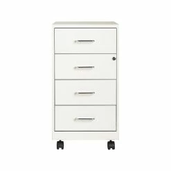 The four-drawer metal mobile organizer is a perfect solution for a small or home office, offering a smart and efficient design for smaller spaces. Features four utility drawers to keep your supplies organized and close at hand. Each drawer features a patented glide suspension for smooth open and close motion and a three-quarter drawer extension to help you locate your files easier. In addition, you can keep your possessions secure by using the built-in lock for the top two drawers. Painted steel surface is nonporous and easy to clean and disinfect. Bring organization and function to your home or office with this stylish four-drawer organizer. Your supplies will always be organized and within reach.
