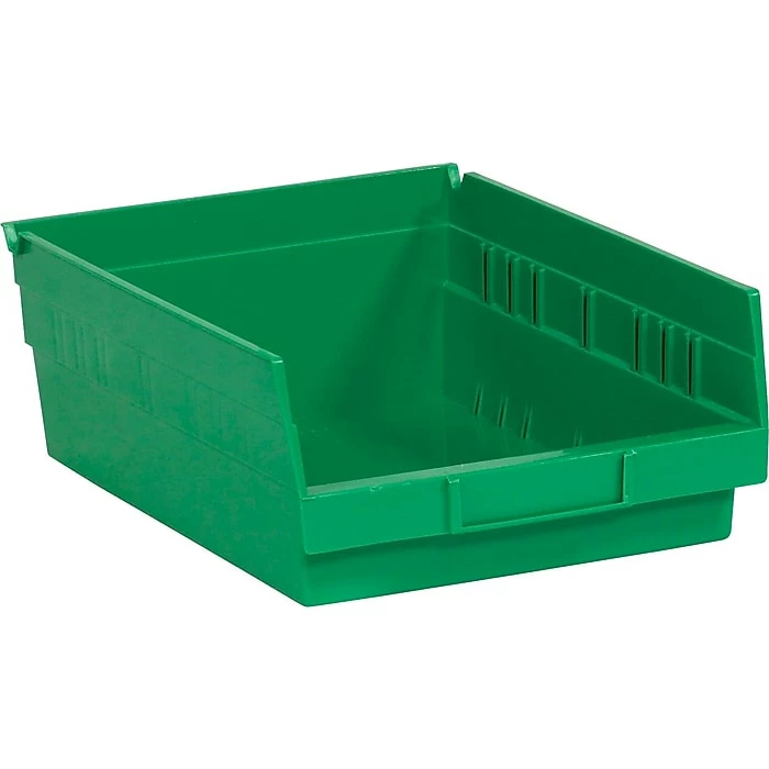 BOx Plastic shelf bin box in green is manufactured from FDA compliant polypropylene resins for added strength and durability. Bin box measuring 11 5/8″ x 8 3/8″ x 4″ has slotted label holder allows for easy insertion of label or identification card.