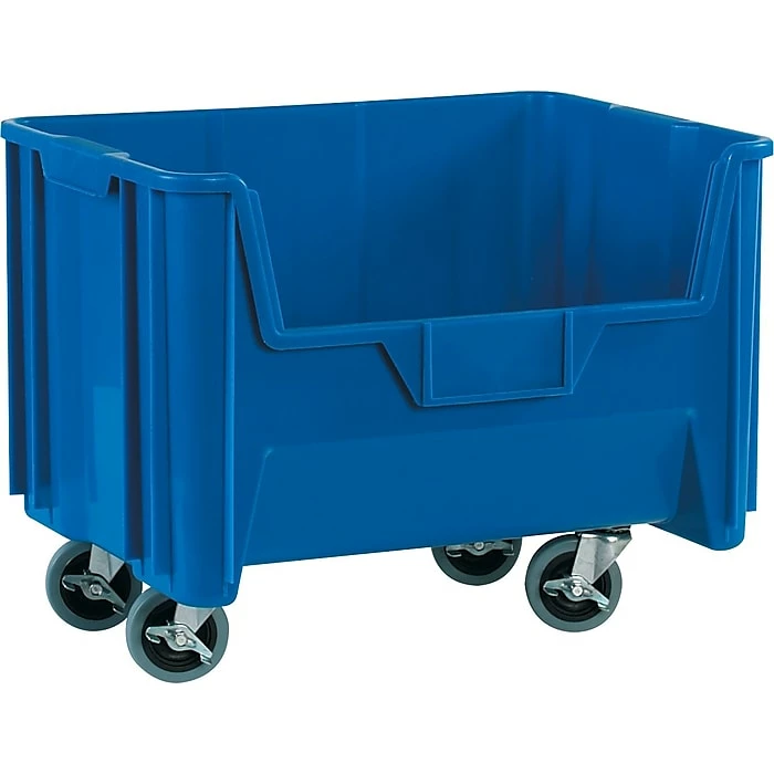 BOx Mobile giant stackable bin in blue color measuring 19 7/8″ x 15 1/4″ x 12 7/16″ contains 4 heavy-duty 3″ casters for stacking the items. Bin features a large label holder to identify the content easily and is perfect for transporting heavy parts.