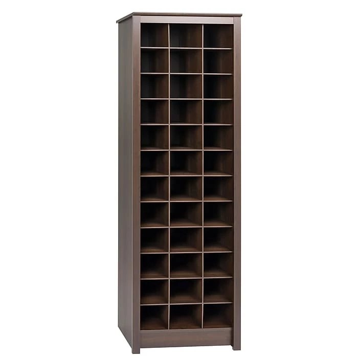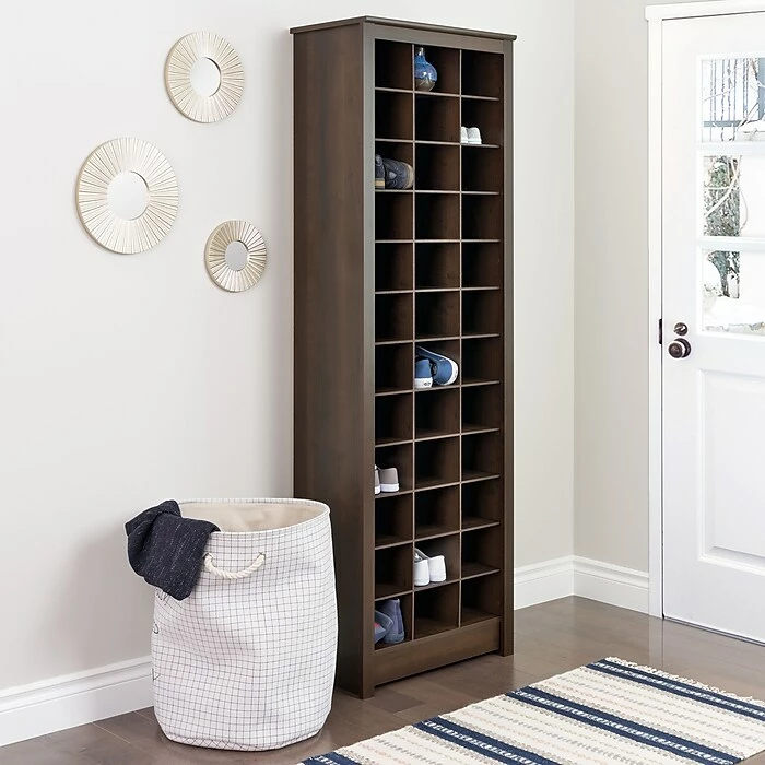 Simply and stylishly organize up to 36 pairs of shoes with the Space-Saving Shoe Storage Cabinet by Prepac. Fit one cabinet in a narrow entryway or combine multiple pieces from the Space-Saving collection in a large mudroom to create a custom closet look at the fraction of the cost. This shoe organizer has 36 spacious cubbies that can be used to store shoes, hats, scarves, keys, mail and any other clutter that needs organizing.