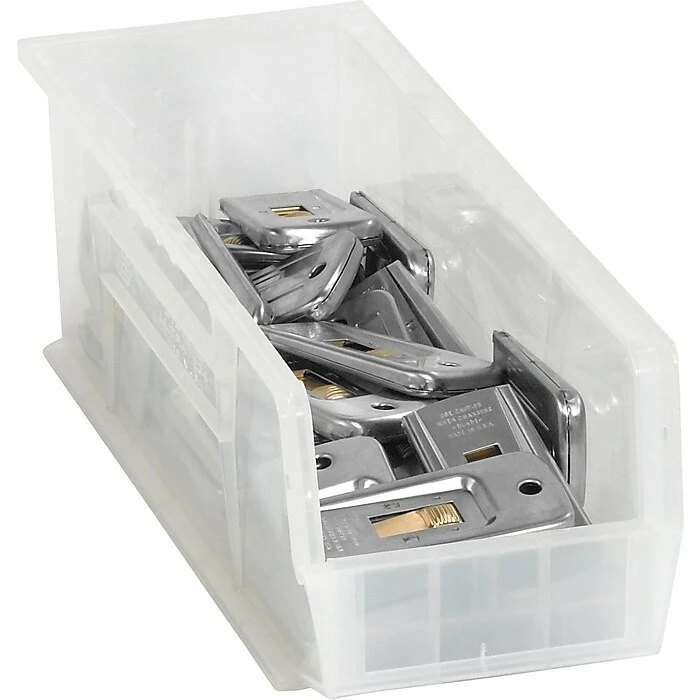 Box Stack and Hang bin box in clear color measuring 14 3/4″ x 5 1/2″ x 5″ is made of plastic for added durability. Box fits shelf size up to 14 3/4″ for holding small items and has a built-in rear hanger that permits bins to hang from lowered rails.