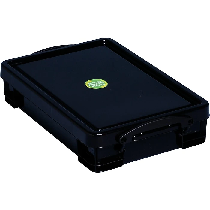The Really Useful Box storage tote features handles with clip locks to secure the lid, offering convenient storage for your documents and utensils. The box is extremely durable and is made of 100% recycled plastic.
