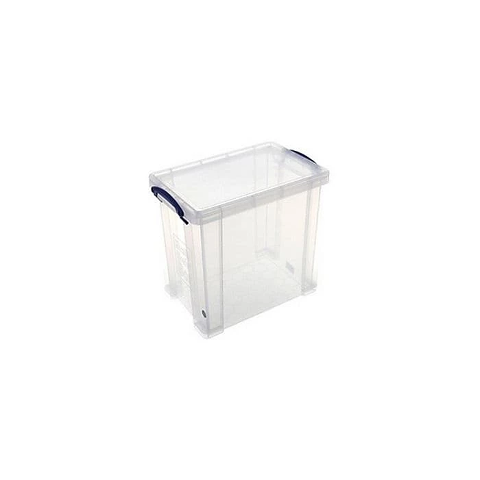 The Really Useful Box® with 19 liter capacity clear can be recycled. Made with 100 percent polypropylene, these boxes are constructed for durability and have reinforced sides to increase compression strength so boxes maintain their shape. Totally flat bottom increases rigidity for stability and allows for perfect stacking with or without lid. The lockable lid is secured with two latchable handles to protect contents of the box from dust and water splashes. It measures 11-1/8″ x 10-1/4″ x 14-1/2″ and is ideal for hanging files & office storage
