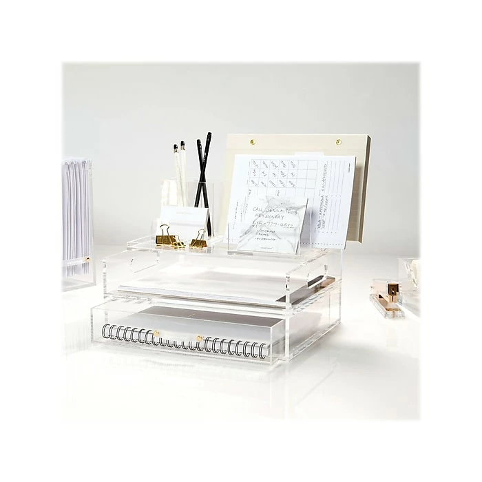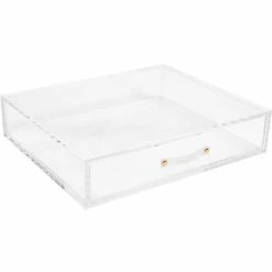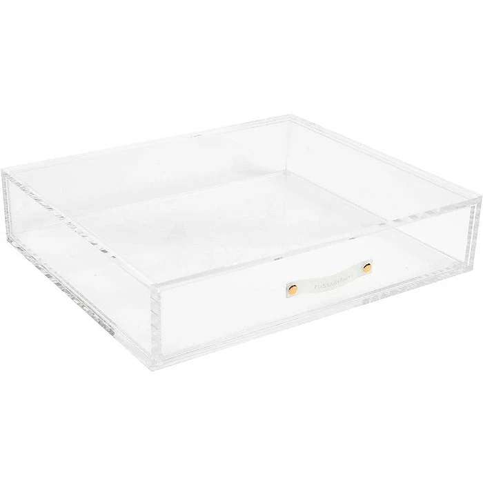 Bring inspiration to your desktop with the aesthetically satisfying Russell+Hazel acrylic drawer. With this crystal clear storage drawer, the focus is kept on your work and not the clutter. Hard cast acrylic is durably constructed with finely polished edges and gold-tone hardware. Useful as a standalone tabletop item, this drawer also integrates with acrylic pieces from the brand’s stackable Bloc collection, including acrylic trays, collator and valet, and smaller items.