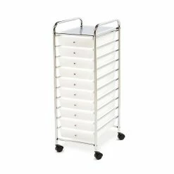 Organize your work and life space today with this multi-purpose Seville Classics 10-Drawer Organizer Cart. This versatile cart is constructed from a sturdy chrome plated steel frame and includes 10 sturdy Frosted White sliding drawers and black casters for added mobility. Each polypropylene drawer has an interior dimension of 9.5″ wide by 13.5″ deep with a height of 2.6″, leaving plenty of space for the storage of just about anything from papers and documents to crafts and classroom supplies to tools. This useful organizer is ideal for use in the office, kitchen, bathroom, dorm room, classroom, garage or work space. This handy cart measures 15.3″ D x 12.8″ W x 38.2″ H.