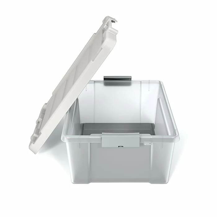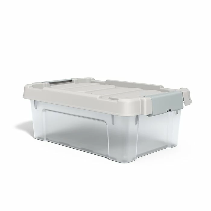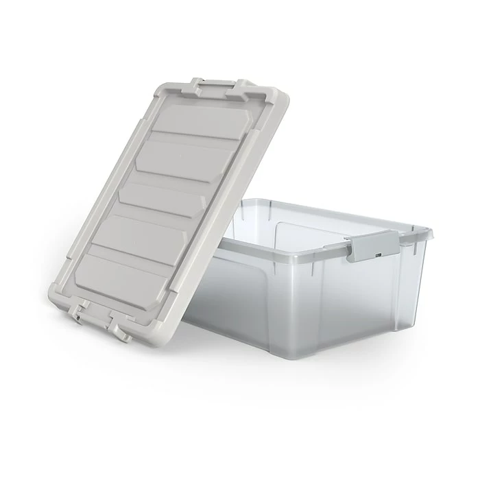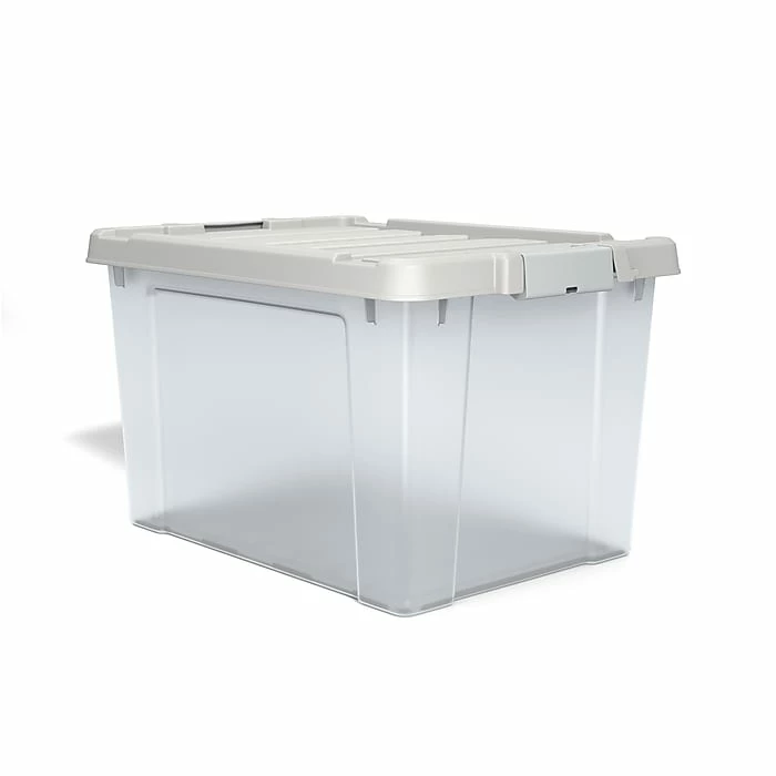 Preserve the prime condition of goods and materials with this latch-lid stackable storage tote. The lock-compatible design offers extra security, while the stackable format lets you streamline your warehouse or store room. High-quality plastic construction delivers long-lasting durability. This TRU RED latch-lid stackable storage tote features easy-snap latches to keep the cover tightly shut and a clear transparent finish to let you easily see the contents.