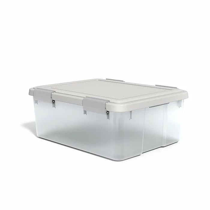 Equip your warehouse and store room with this weathertight stackable storage bin. The transparent finish offers clear visibility for easy access, while the reinforced lid safeguards the contents from dirt and liquid. Use the snap-on latches to keep the cover tightly secure. This TRU RED weathertight stackable storage bin features sturdy plastic for long-lasting durability even when stacked with other bins.