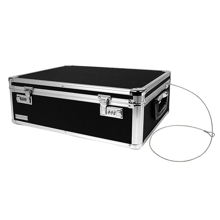 Vaultz® Locking storage chest in black color is constructed from aluminum for added durability and is perfect for keeping your room valuables. Storage chest contains tether, sturdy chrome-steel corners with security cable for added protection.